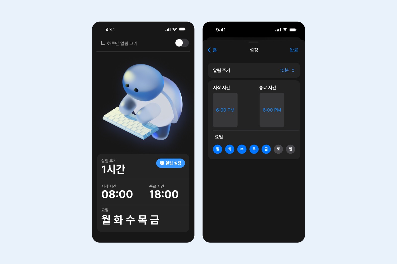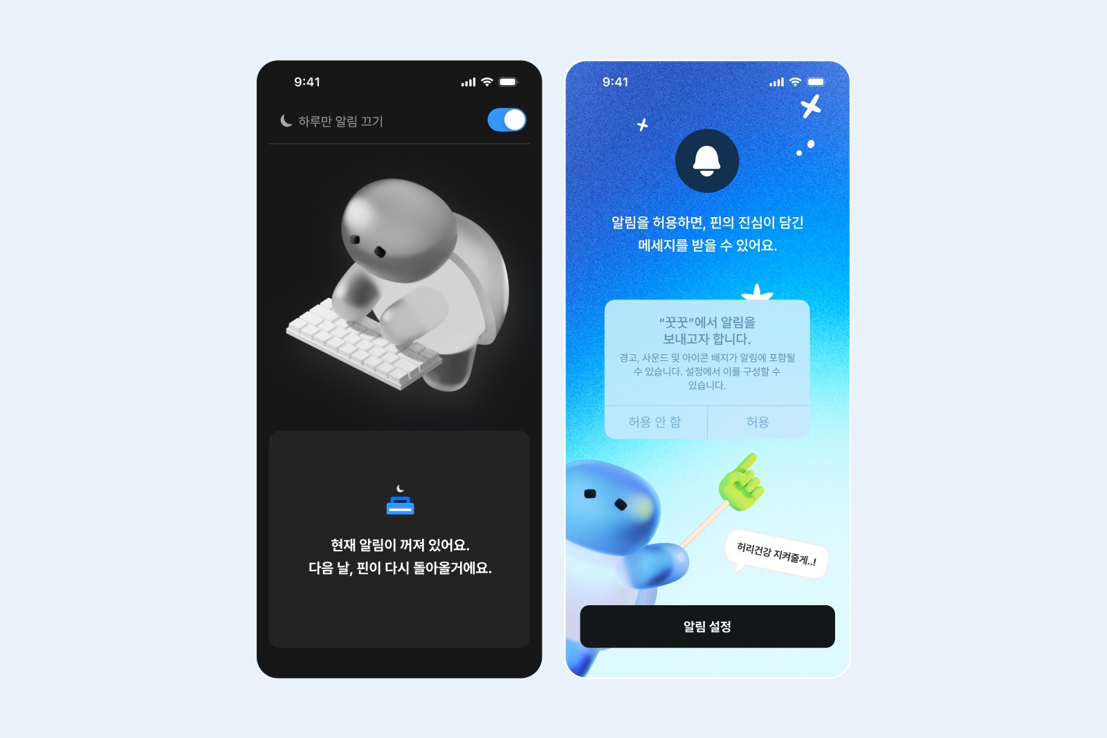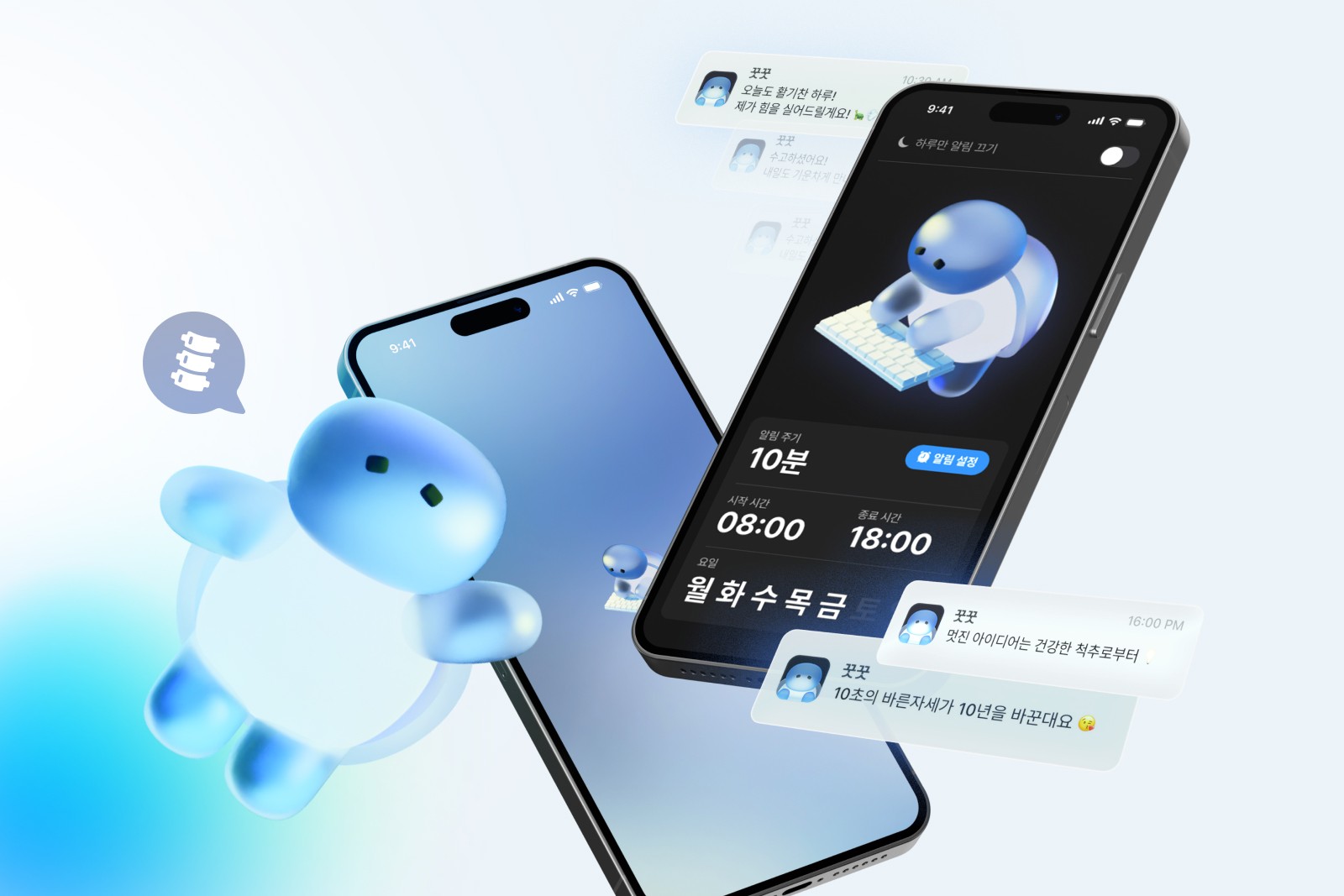 꿋꿋 started from a simple observation: it's hard to maintain good posture during long hours at a desk. The app delivers scheduled posture reminders through '핀', a spine-fairy turtle character — reframing a cold machine notification as a warm, caring nudge that's harder to dismiss.