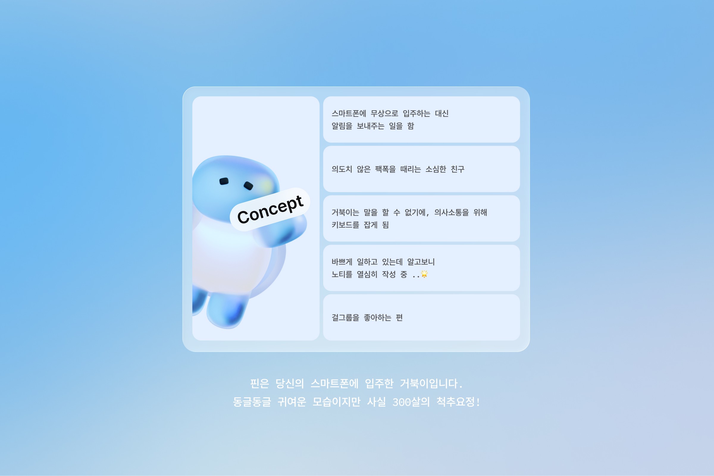 장시간 앉아 일하는 환경에서 바른 자세를 유지하기 어렵다는 문제에서 출발했습니다. 척추요정 거북이 캐릭터 '핀'이 정해진 시간마다 거북목 교정 알림을 보내는 앱으로, 차가운 기계의 알림을 귀여운 존재의 진심 어린 말 걸기로 전환해 거부감을 낮췄습니다.